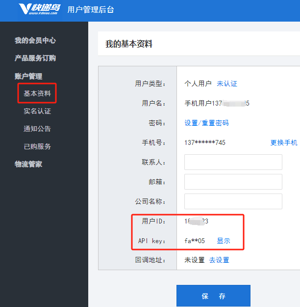 2.3.点击基本资料,将用户ID、API key分别粘贴到EBusinessID和APPKEY中,点击保存即可