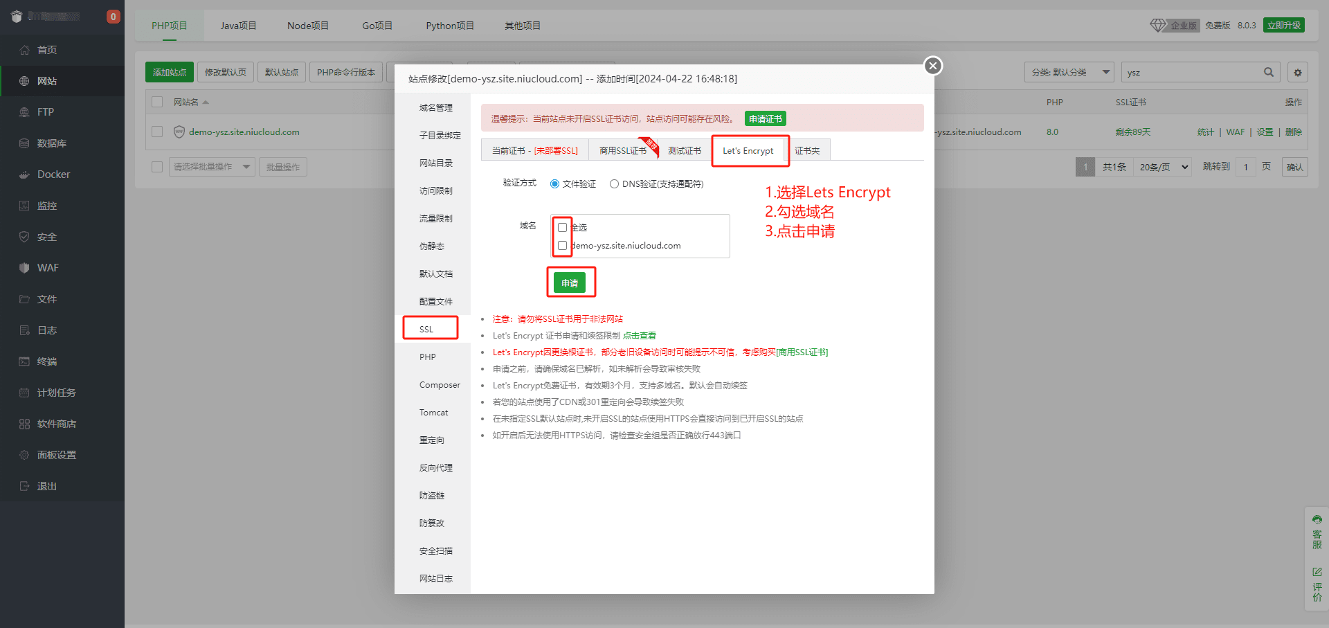 1.添加站点。点击左侧菜单“*网站→添加站点”