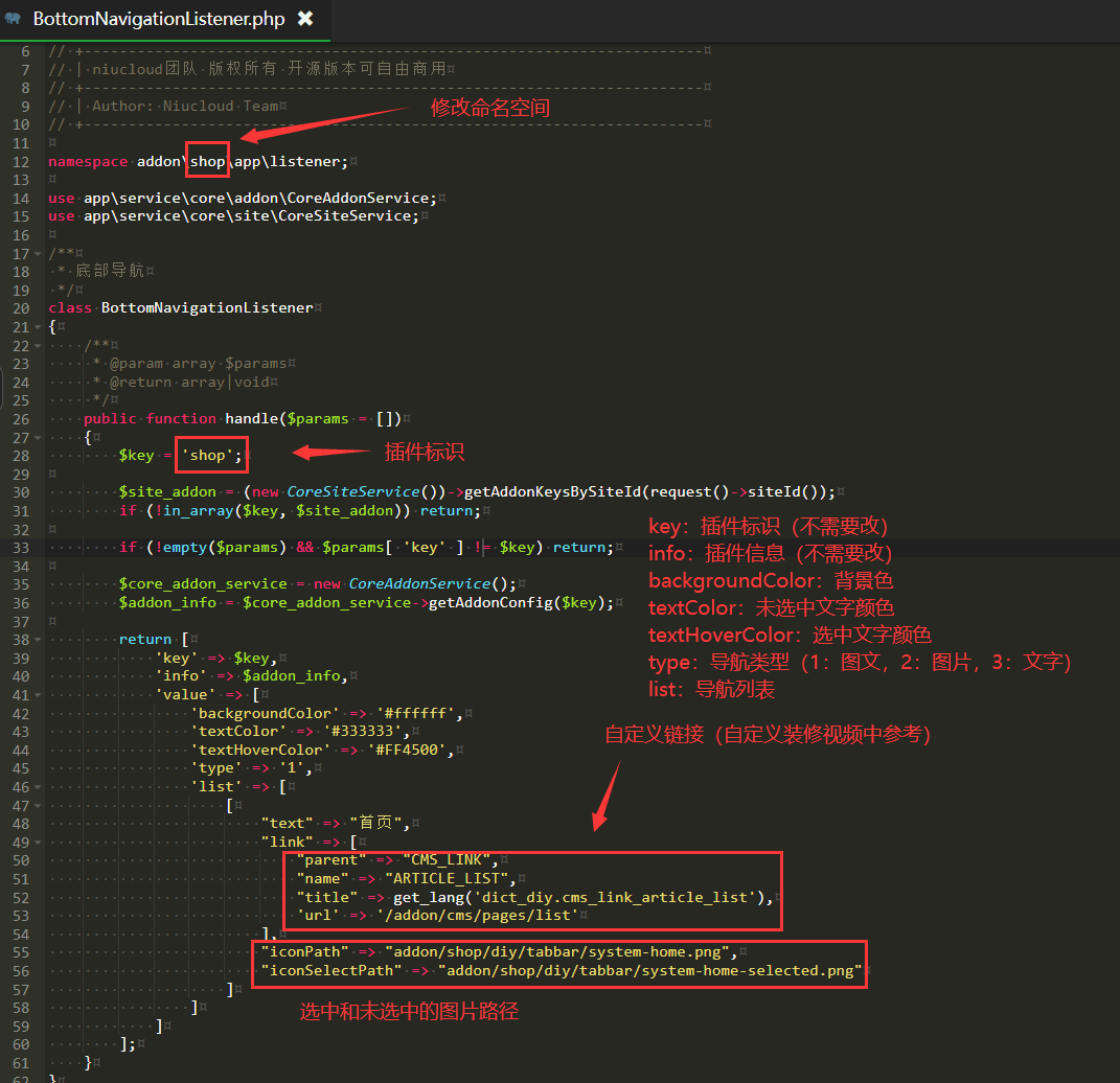 1、先复制其他应用中路径下的导航事件文件BottomNavigationListener.php( 路径:niucloud/addon/shop/app/listener/BottomNavigationListener.php)