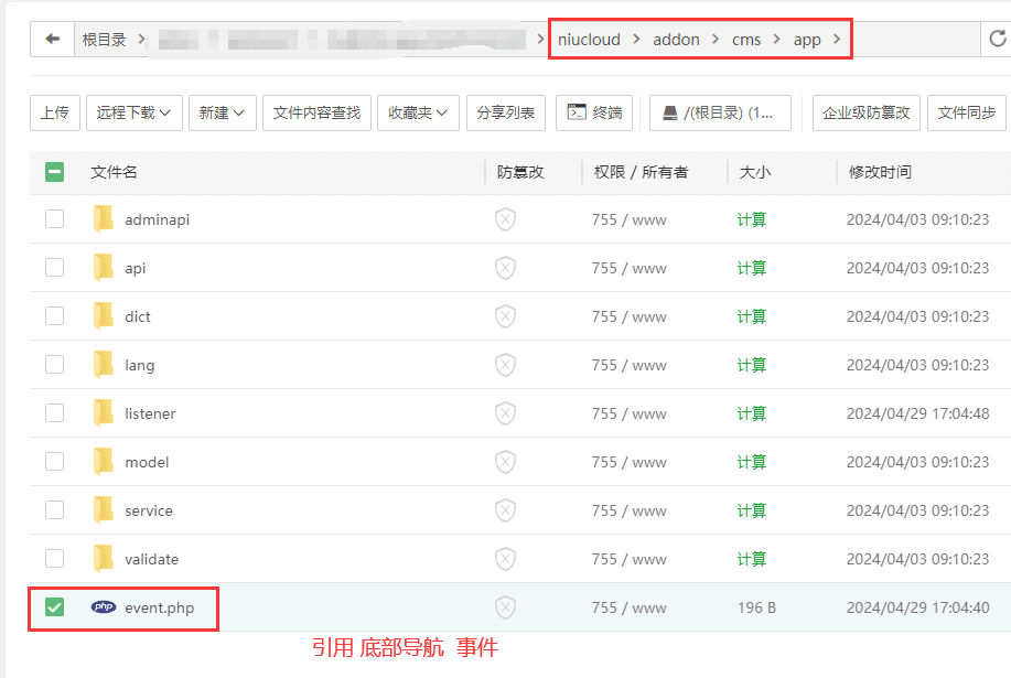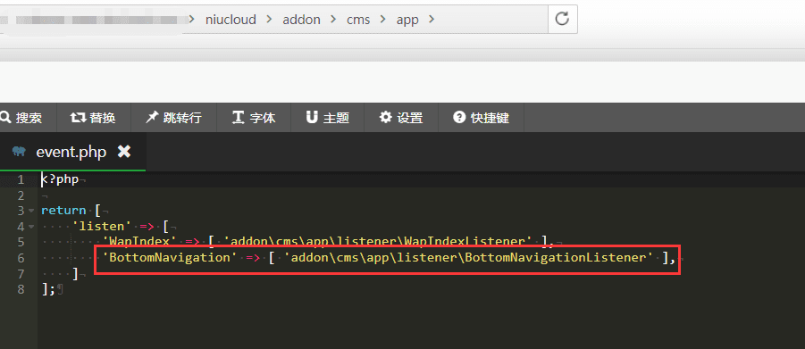 4.在创建的应用中引用底部导航事件,文件路径示例:(niuclould/addon/cms/app/event.php)