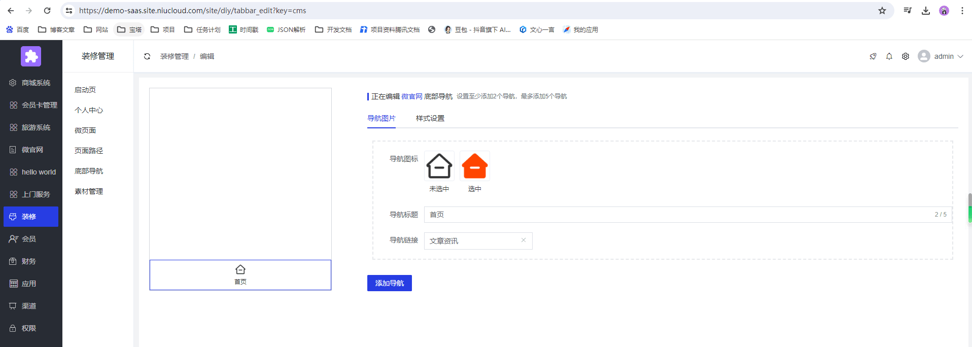 6.打开后台,选择装修,点击底部导航,新建的底部导航就会出现