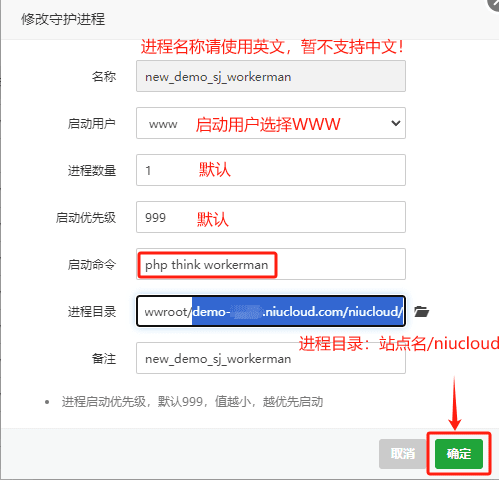 2.2进程名称请使用英文,暂不支持中文!启动用户选择WWW,运行目录选择程序的根目录下的niucloud(站点名/niucloud),输入下方命令,保存即可。