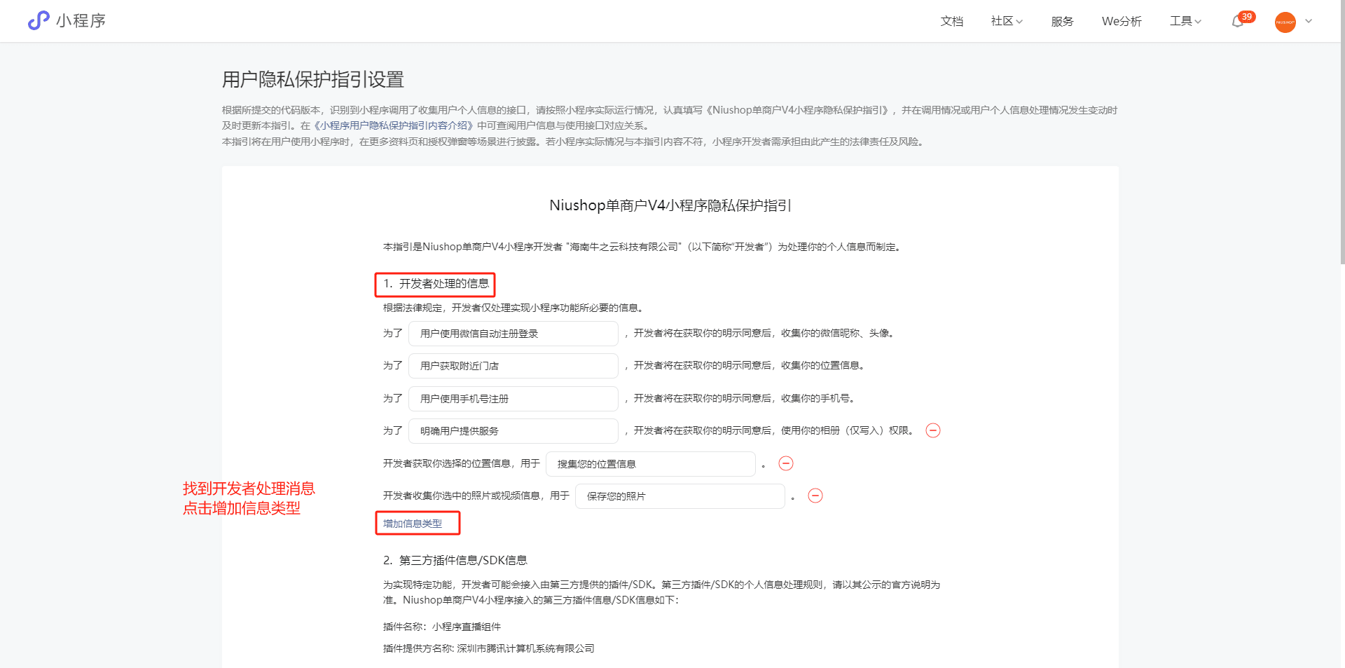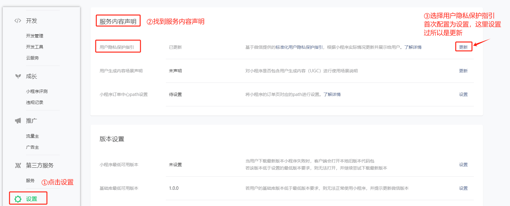7.1.登录微信小程序平台,侧边栏点击设置,找到服务内容声明,选择用户隐私保护指引,点击设置/更新
