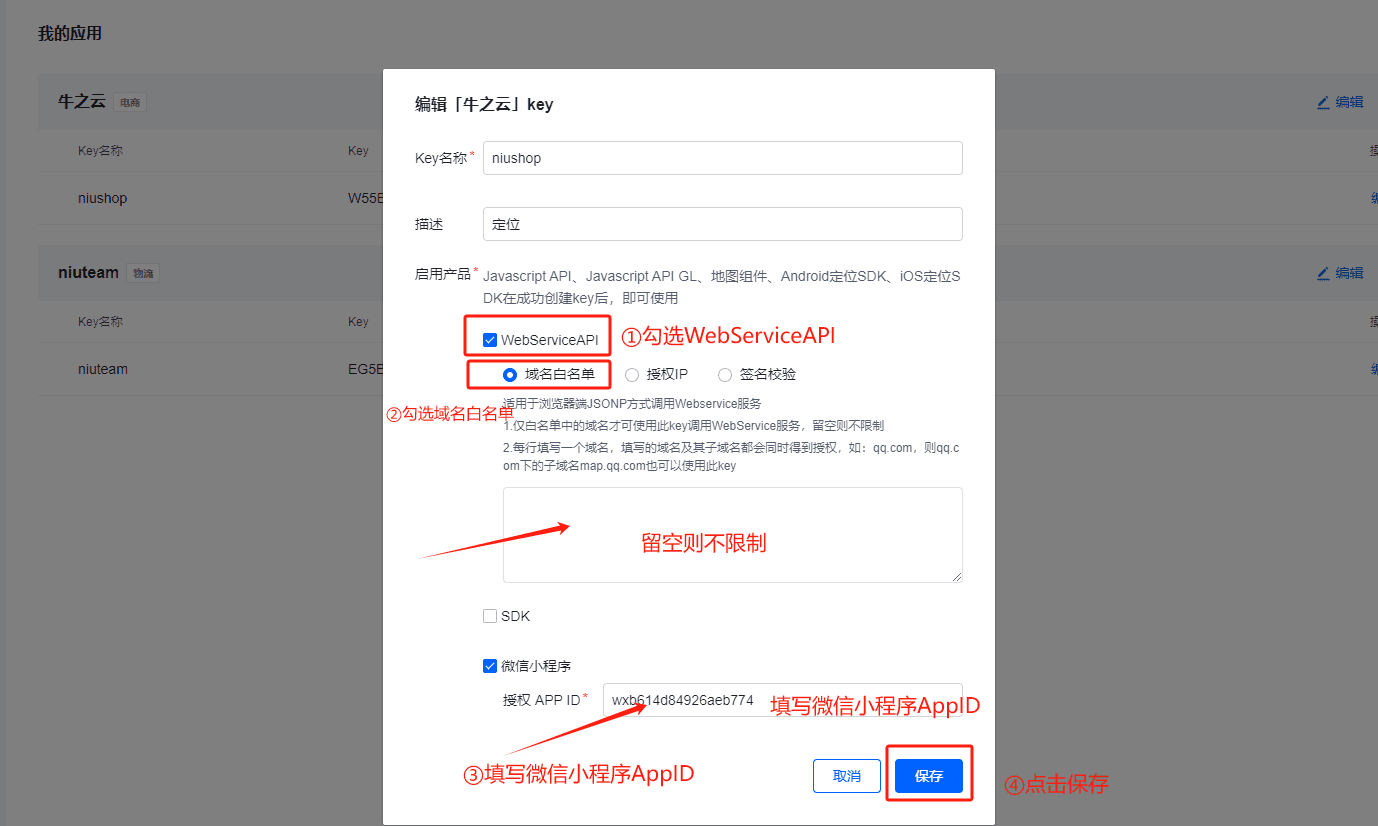 5.输入Key名称、描述,勾选WebServiceAPI,点击域名白名单,填写授权AppID(小程序配置中,2.2小程序开发信息有教程)