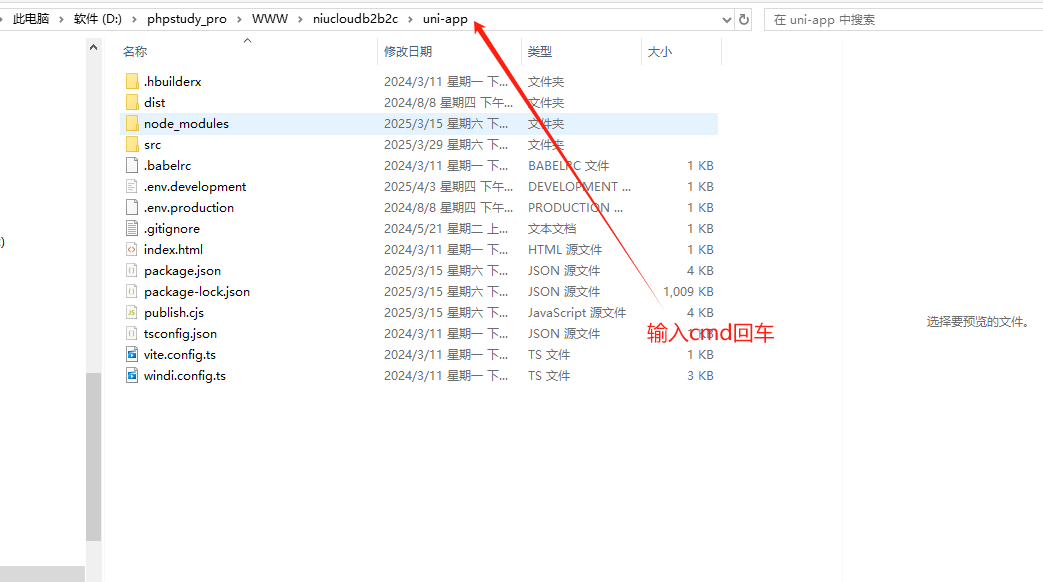 打开uniapp文件,在文件路径处输入cmd,点击回车