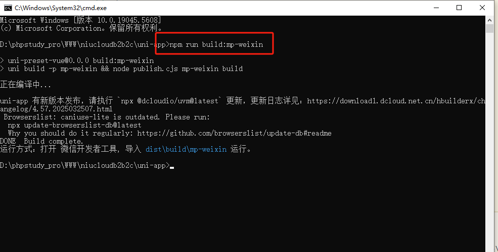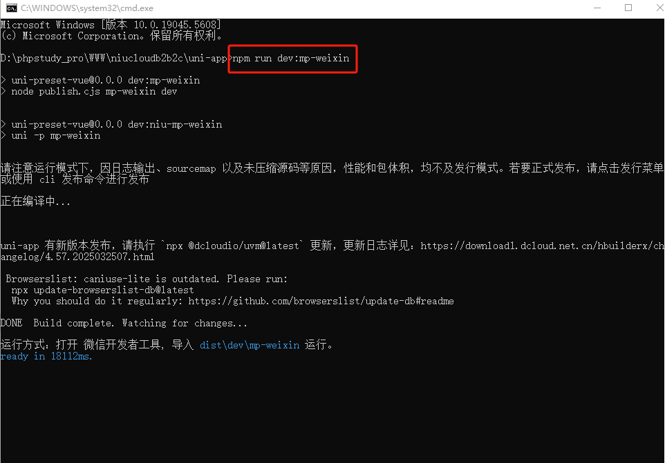 2.在弹出的命令框输入npm run dev:mp-weixin,点击回车
