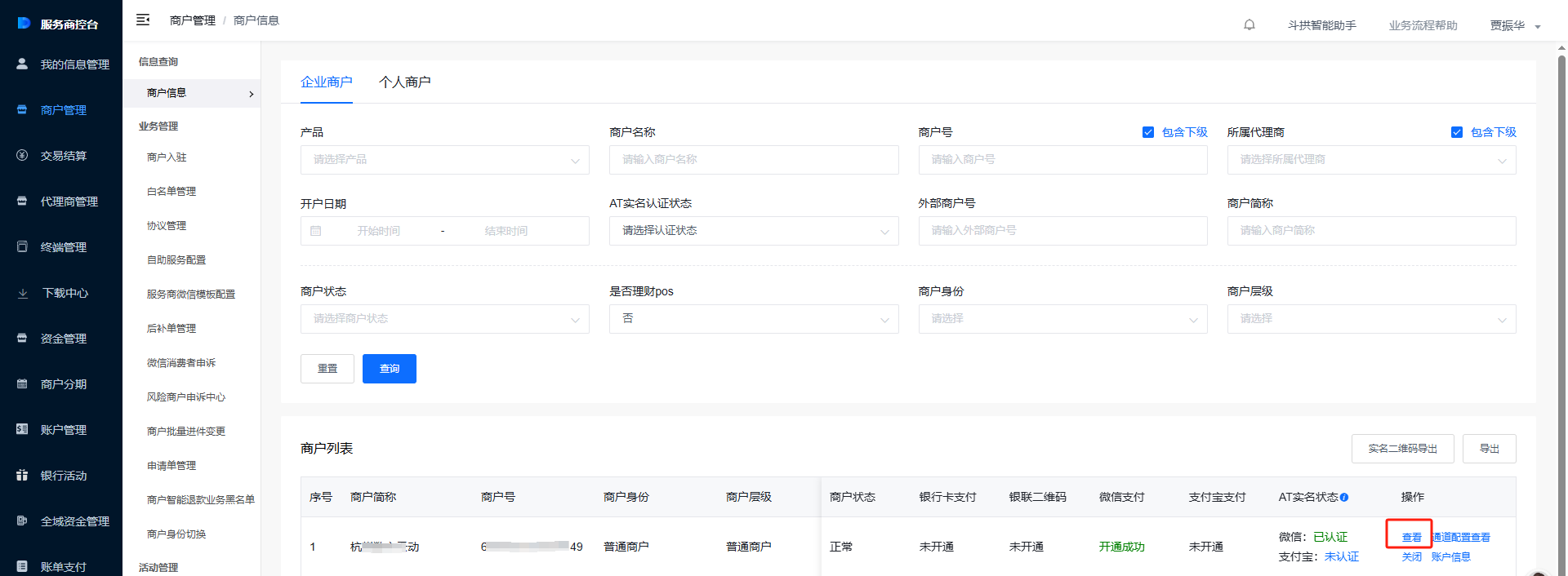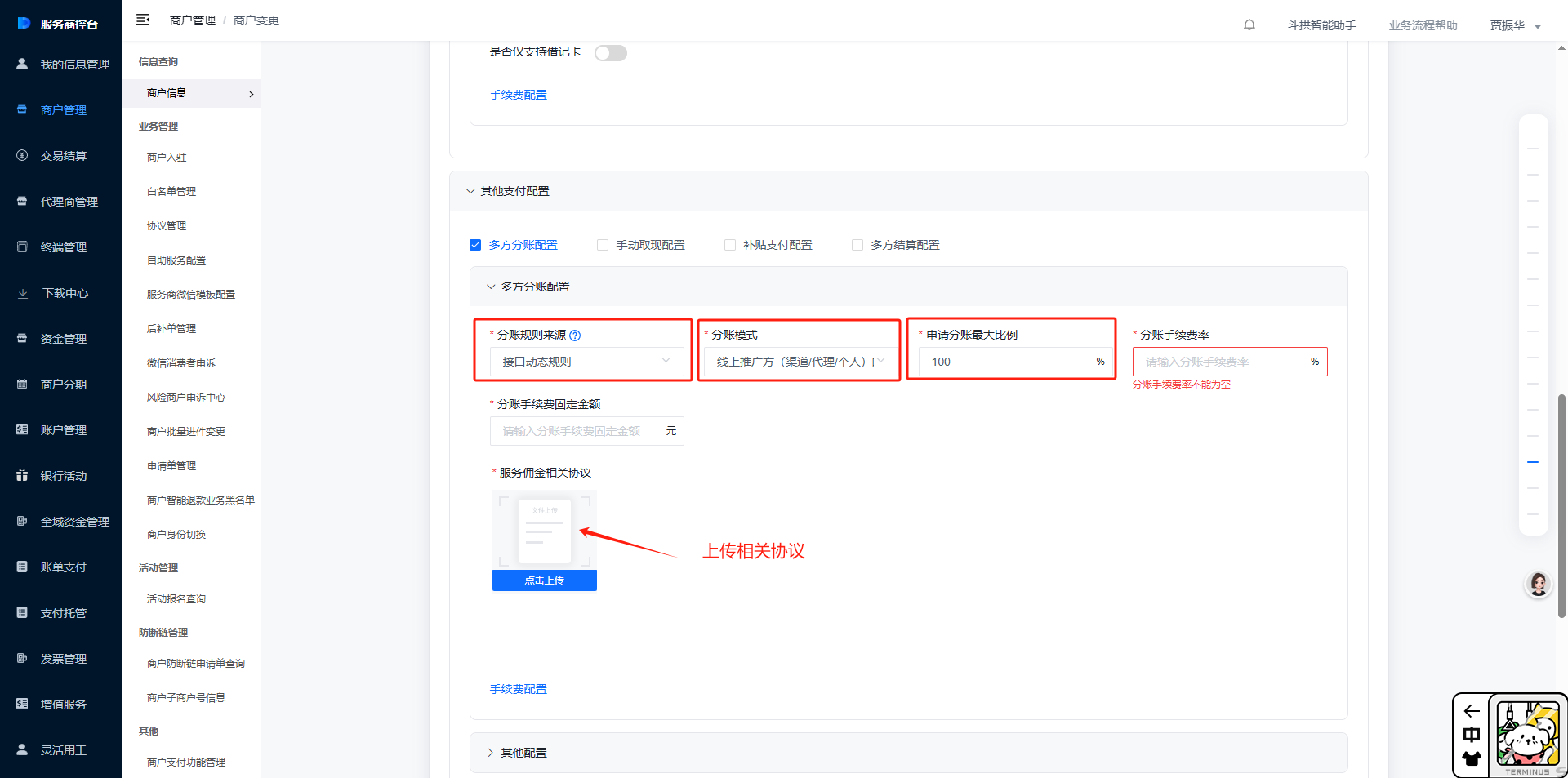 6.配置完成后需开启商户的多方分账配置,商户信息--选择要操作的商户--查看--商户变更--其他支付配置--多方分账配置