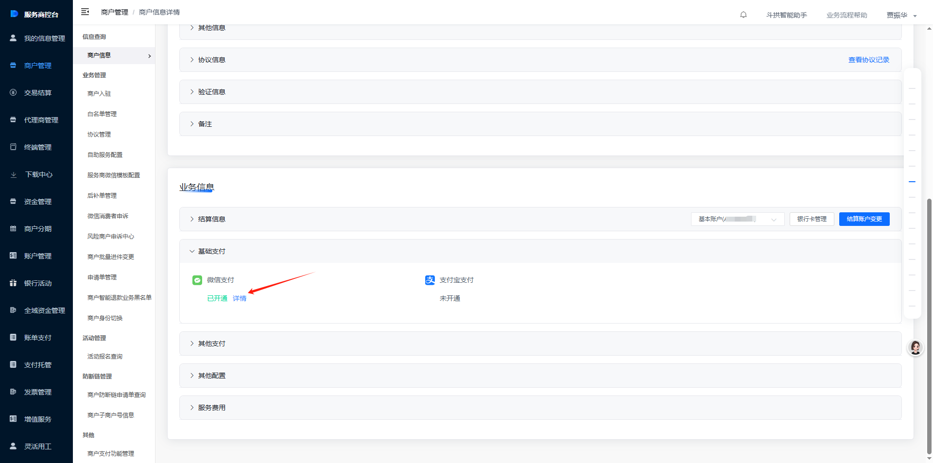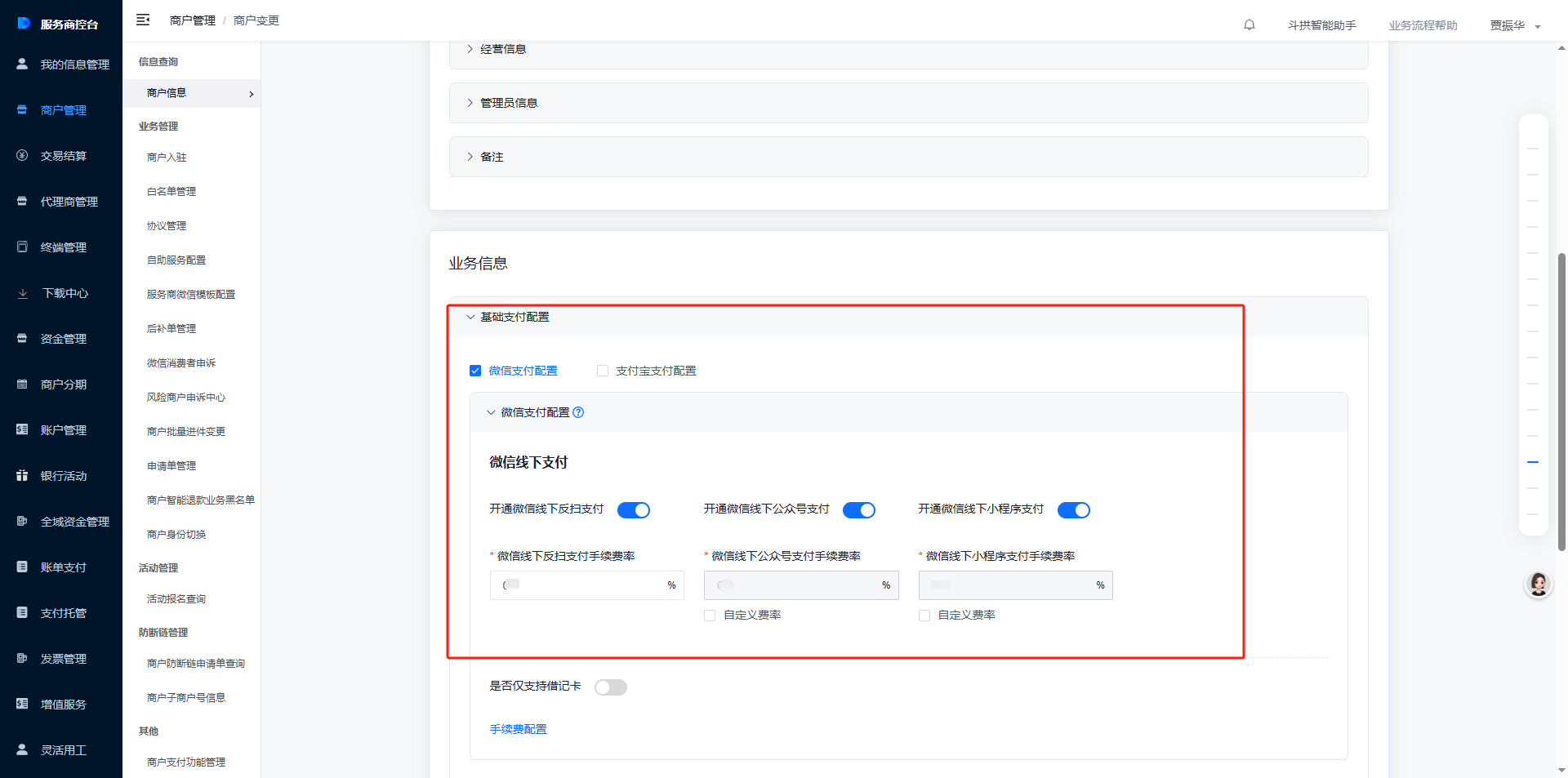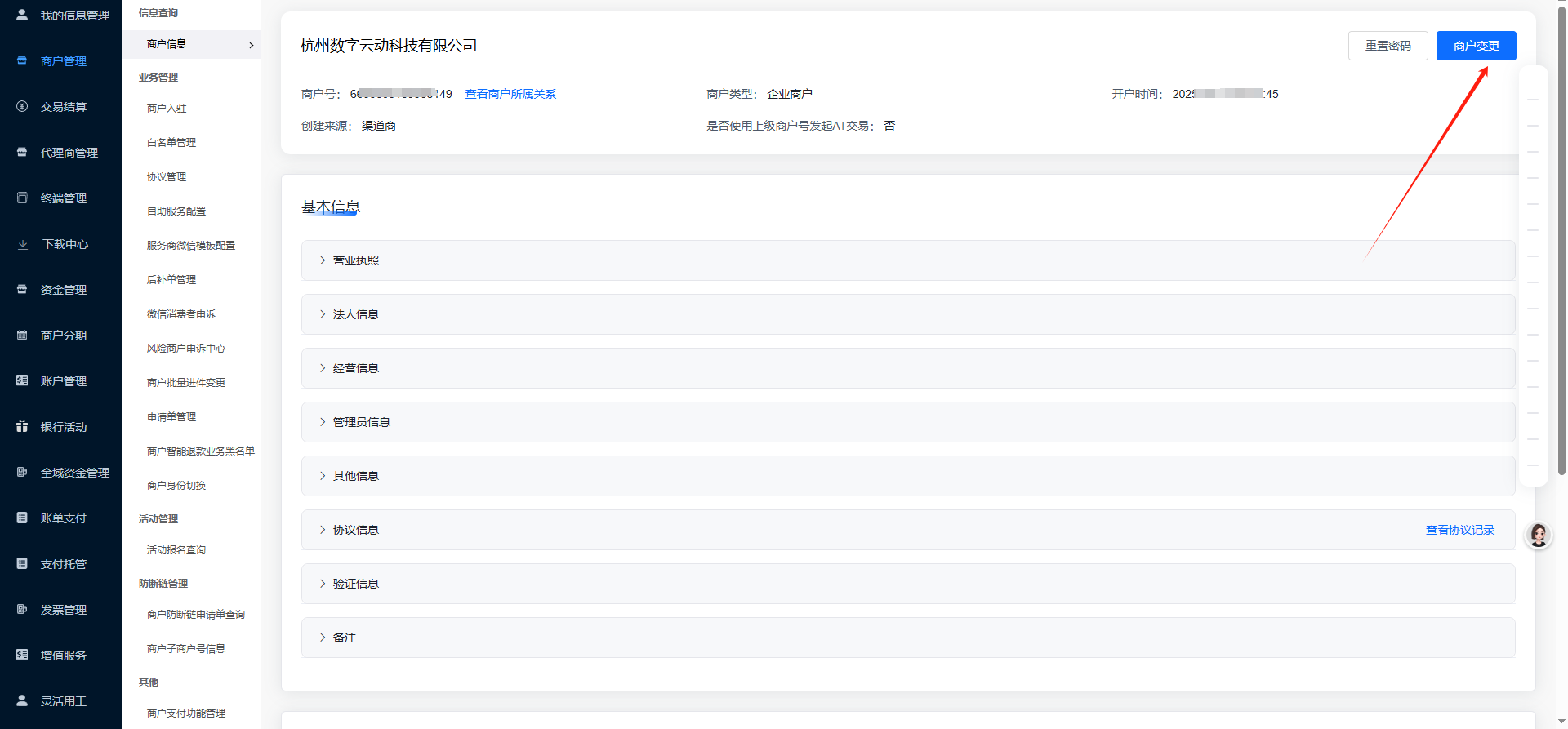 8.点击商户变更,在业务信息中添加基础支付配置即可