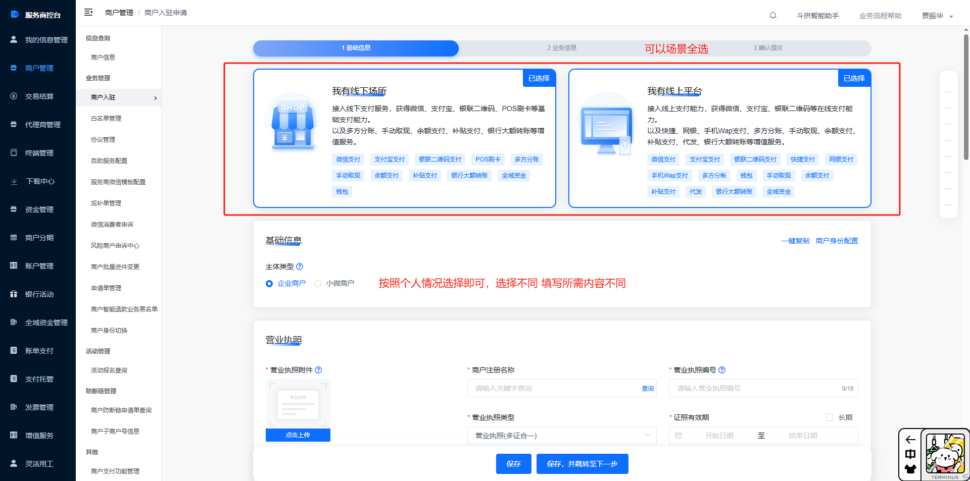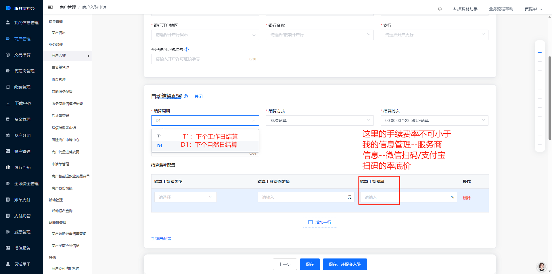 注意:在第二步业务信息里面,结算手续费率不可小于我的信息管理--服务商信息--微信扫码/支付宝扫码中的率底价