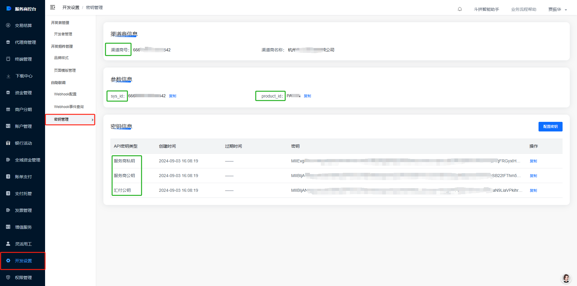 5.配置后台,开发设置--密钥管理将设置项粘贴到后台