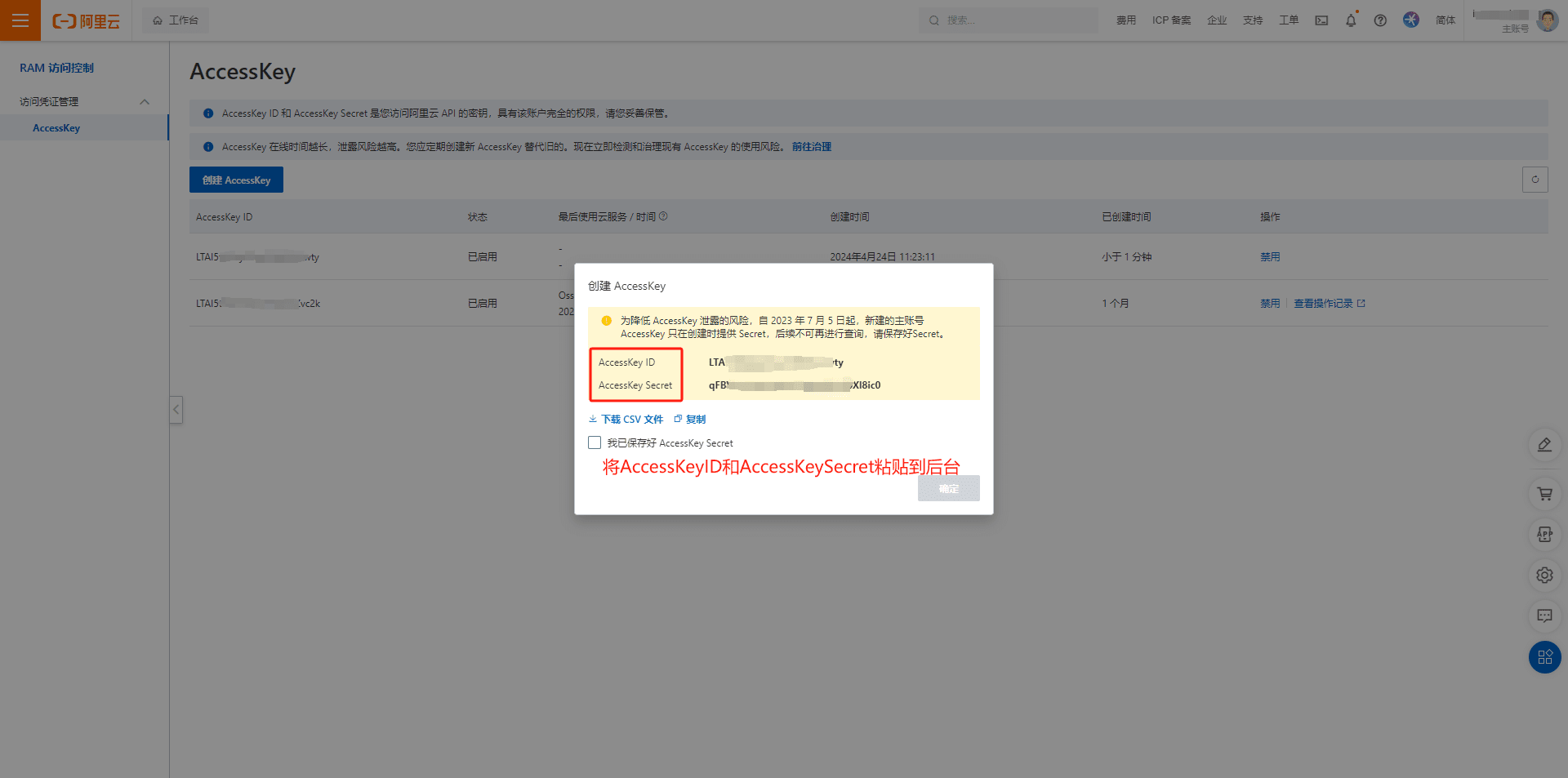 4.AccessKey创建成功后,AccessKey ID 和 AccessKey Secret 是您访问阿里云 API 的密钥,具有该账户完全的权限,请您妥善保管。如下图所示: