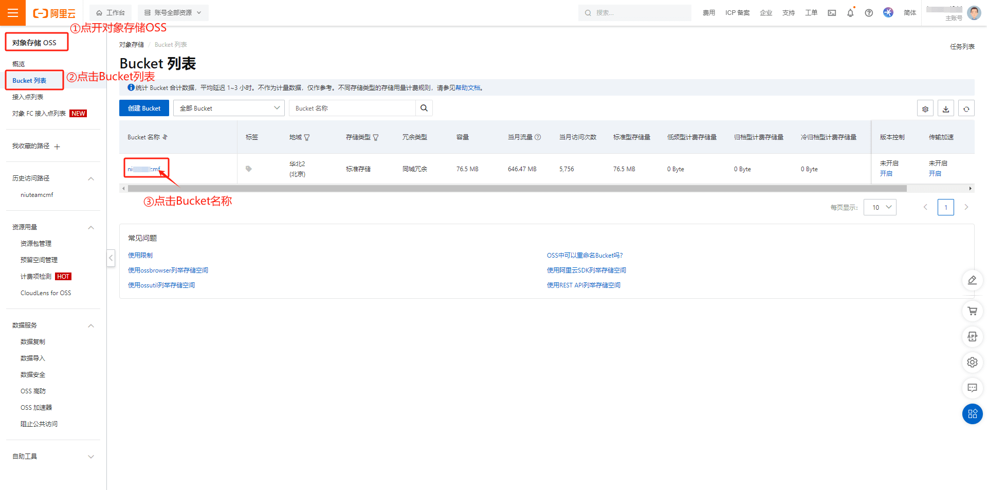 3.存储空间名称在Bucket列表获取,阿里云上创建一个Bucket