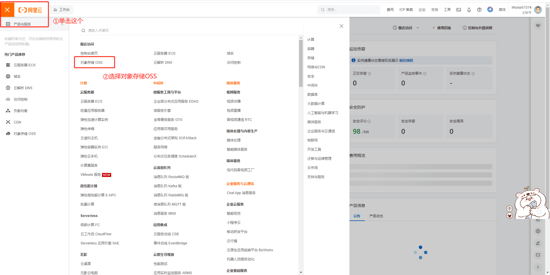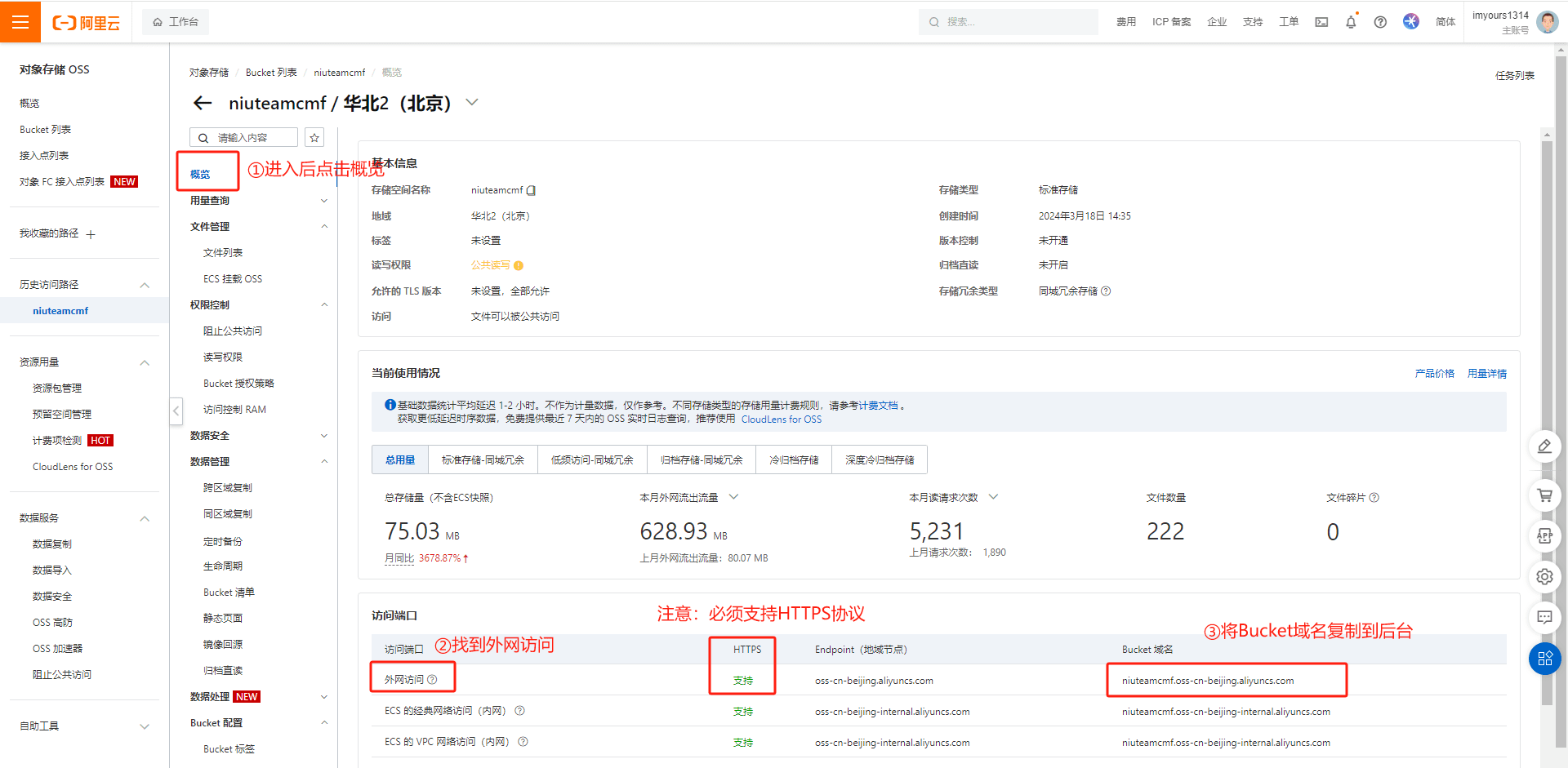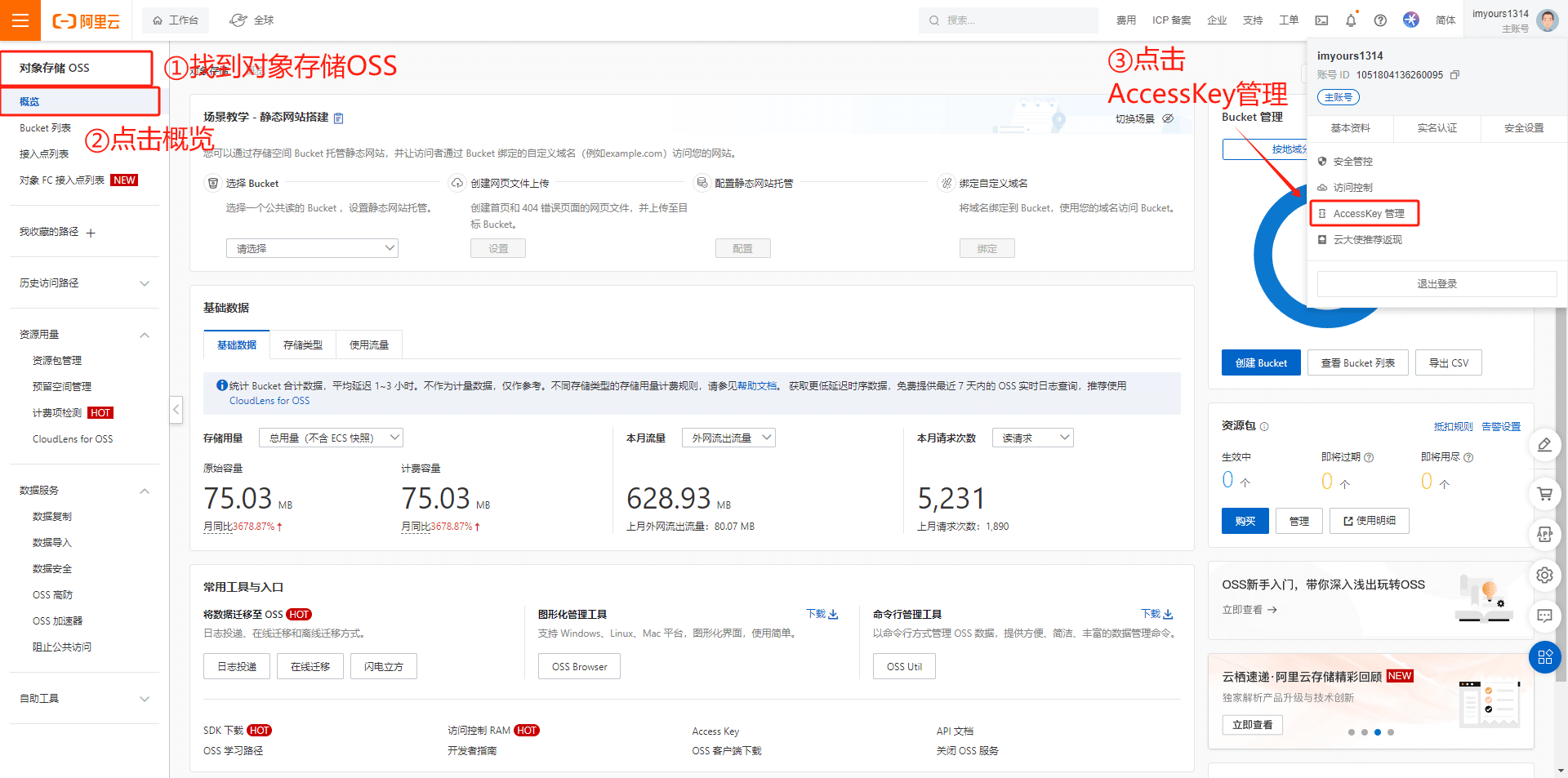 2.在对象存储OSS中,鼠标移至右上角头像,点击找到AccessKey管理,找到AccessKeyID和AccessKeySecret: