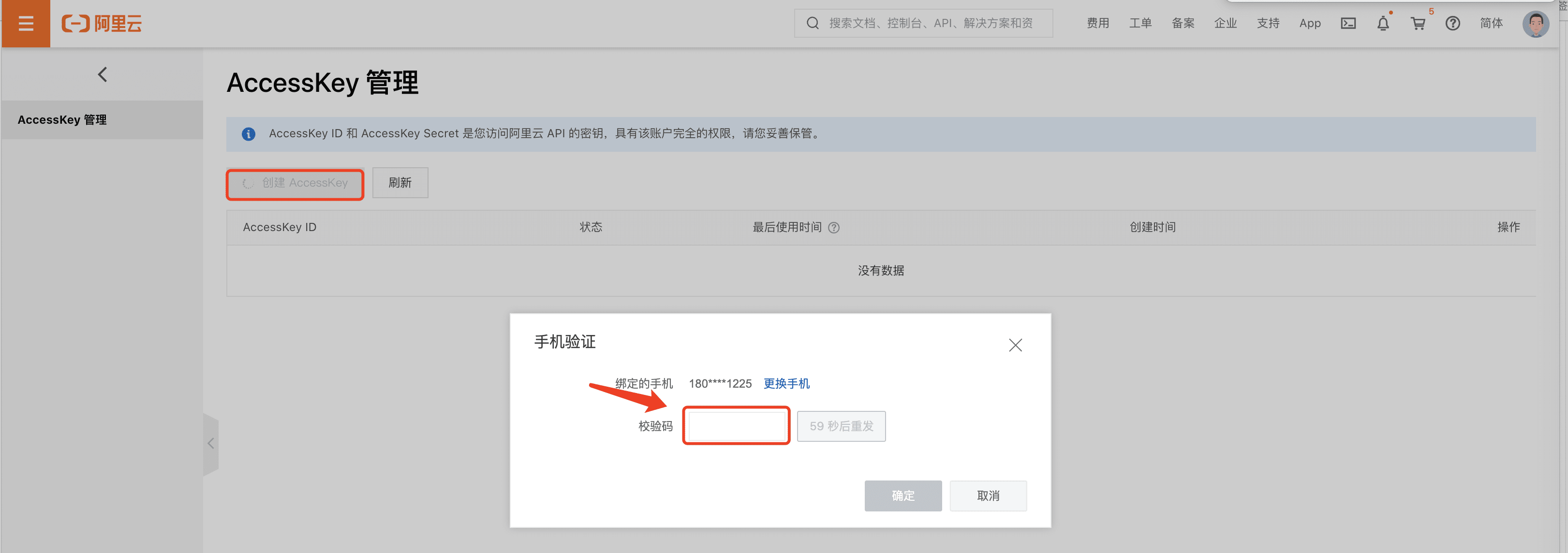 3.如果列表中已AccessKey点击查看查看 Secret,如果没有单击【创建AccessKey】,完成手机验证后就可以创建AccessKey ID和AccessKey Secret。如下图所示: